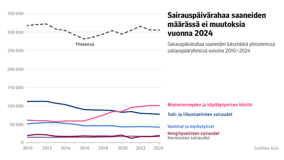 Kuvio: Sairauspäivärahaa saaneiden lukumäärä yleisimmissä sairauspääryhmissä vuosina 2010–24. Kuvasta näkee, että sairauspäivärahaa saaneiden määrässä ei tapahtunut juurikaan muutoksia viime vuonna.