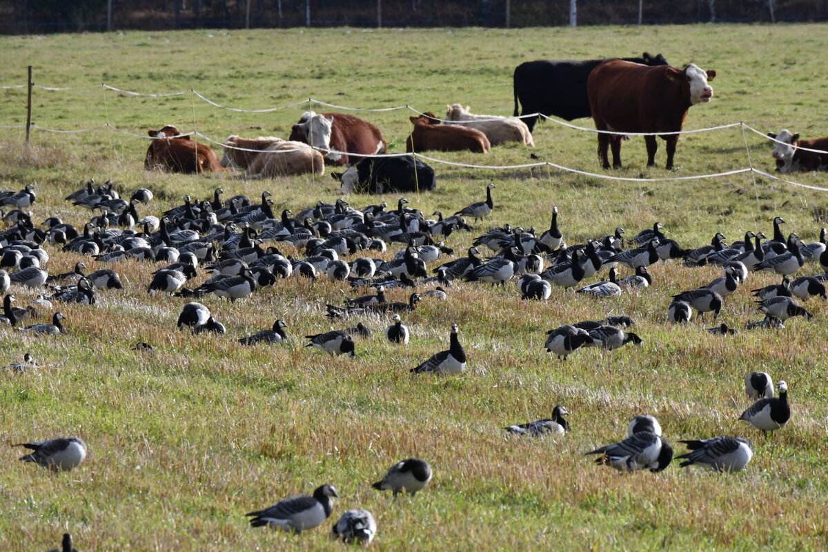 Valkoposkihanhet suosivat laiduntamista niille varatuilla hanhipelloilla