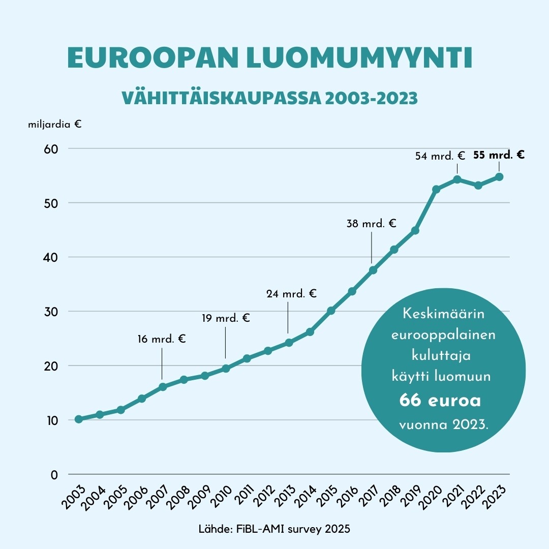 Kokonaisuudessaan luomun markkina Euroopassa kasvoi vuonna 2023 kuitenkin vain kolme prosenttia ja oli 54,7 miljardia euroa. Erityisen voimakasta kasvua nähtiin Virossa (+13,0 %), Alankomaissa (+12,5 %) ja Belgiassa (+9 %), mutta myös Euroopan suurimmassa luomumarkkinassa Saksassa (+5,0 %) luomumyynnin arvo kasvoi selvästi.