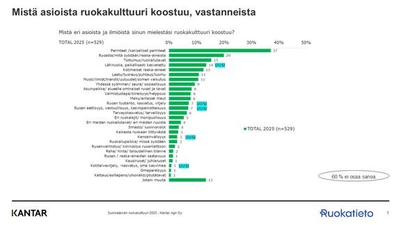 – Erityisen mukava on huomata se, että suomalaisuus on hiipinyt ruokakulttuuriin ilmiönä. Tämä kertonee siitä, että suomalaiset ovat alkaneet nähdä oman maan ruokakulttuurin olemassaolon aiempaa selkeämmin, toteaa Ruokatieto Yhdistyksen kehityspäällikkö Minna Asunmaa tiedotteessa.