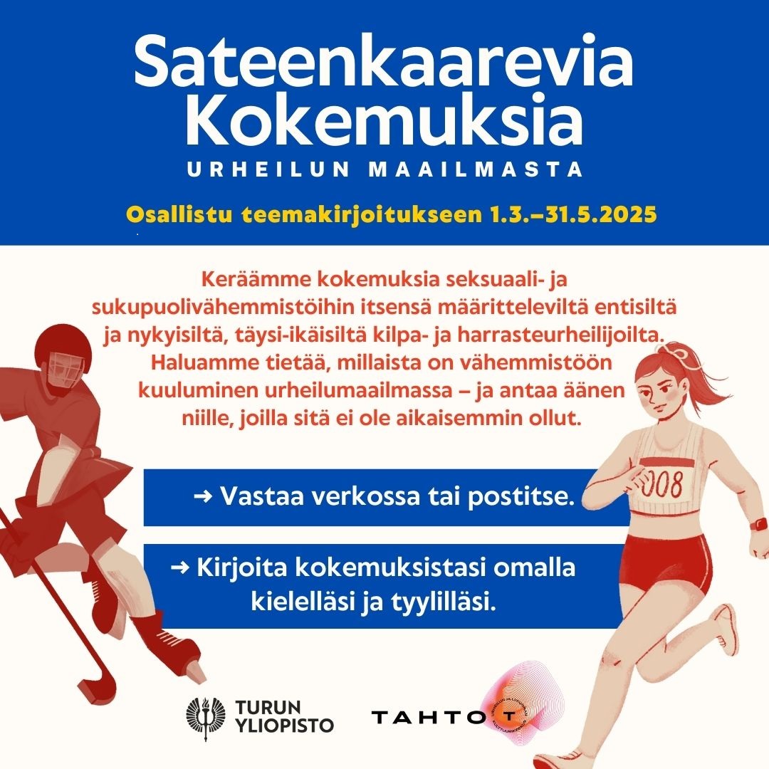 Tutkijat haluavat antaa äänen niille, jotka itse kuuluvat urheilumaailman vähemmistöihin. Kirjoituskutsun esittävät Turun yliopiston digitaalisen kulttuurin, maiseman ja kulttuuriperinnön tutkinto-ohjelma yhdessä Urheilun ja liikunnan kulttuurikeskus Tahdon kanssa.
