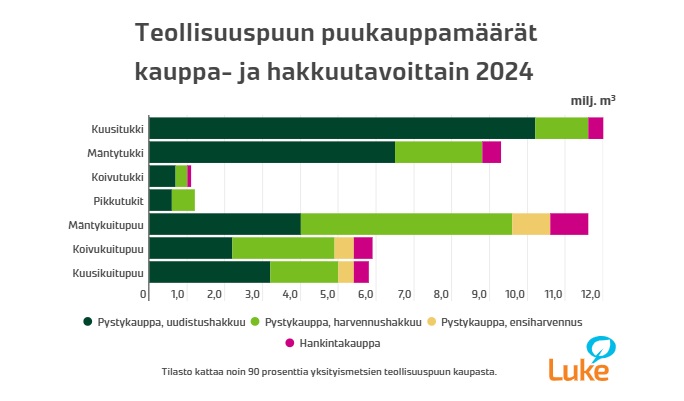 Viime vuosi oli poikkeuksellisen vilkas puukauppavuosi. Edellisvuoteen verrattuna teollisuuspuun ostomäärä lisääntyi 18 prosenttia ja edellisen viiden vuoden keskiarvoon verrattuna kasvua oli 20 prosenttia. Kokonaismäärä nousi tilastointihistorian toiseksi suurimmaksi ja jäi ainoastaan viisi prosenttia pienemmäksi kuin puukaupan huippuvuonna 2018.
