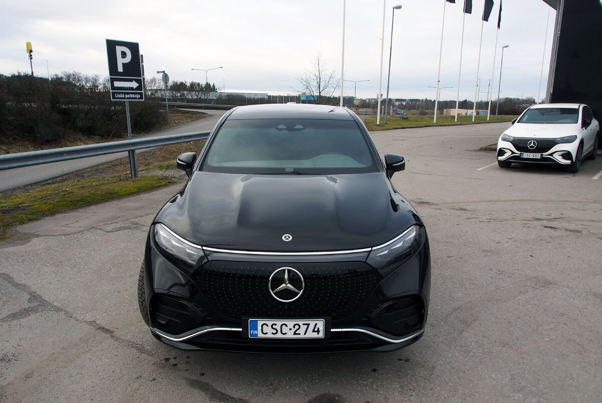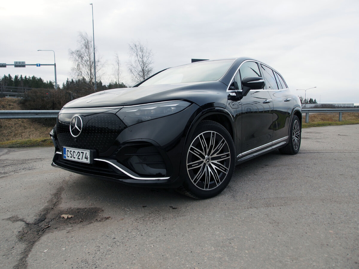 Koeajoon otettiin tällä kertaa täyssähköinen katumaasturi Mercedes-Benz EQS SUV. Se on möhkäle, mutta erittäin tyylikäs sellainen. Etusäleikössäkin on uutta ilmettä. Irvistävän kromigrillin sijaan keskellä on tuttu johtotähti, jota reunustavat kymmenet pienet tähdet. Ratkaisu on Mersun mittakaavassa suorastaan söpö.