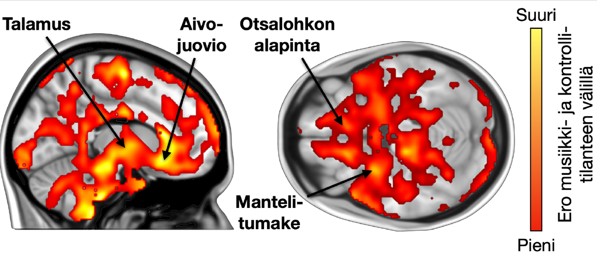 – Aivojen opioidijärjestelmä osallistuu myös kivun lievittämiseen. Tutkimustulostemme perusteella aiemmin havaittu musiikin kipua lievittävä vaikutus voi siis perustua musiikin aiheuttamaan opioidivasteeseen aivoissa, professori Lauri Nummenmaa jatkaa.