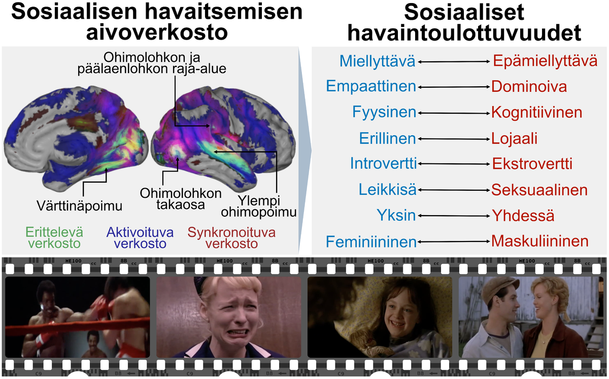 Tutkimuksessa ihmiset katsoivat lyhyitä kohtauksia elokuvista ja arvioivat yli sadan sosiaalisen piirteen esiintymistä niissä. Tietyt havaintopiirteet liittyivät toistuvasti toisiinsa, minkä perusteella tutkijat tunnistivat sosiaalisen havaitsemisen kahdeksan perusulottuvuutta. Aivojen toimintaa tutkittiin toiminnallisen magneettikuvauksen avulla lyhyiden videoiden katselemisen aikana. Näköjärjestelmää taas tutkittiin silmänliikekameran avulla elokuvien katsomisen aikana.