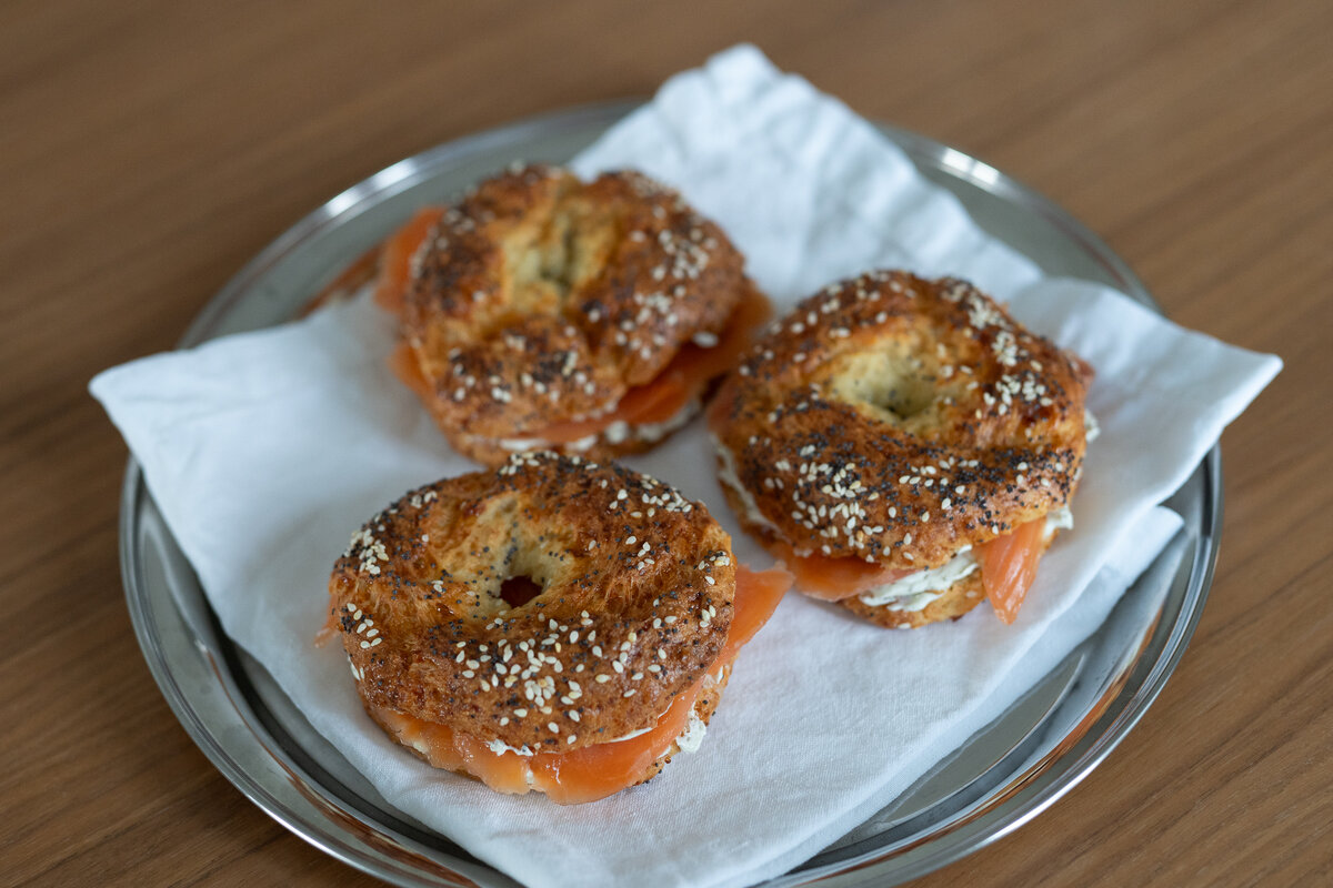 Bagelin väliin sopii parhaiten tuorejuusto, maustettu tai maustamaton, ja sitten bagelit voikin täyttää omilla suosikkitäytteillä. Esimerkiksi kylmäsavulohi, kaprikset ja viipaloitu punasipuli. Tai paistettu kana ja pekoni, sekä jäävuorisalaatti.
