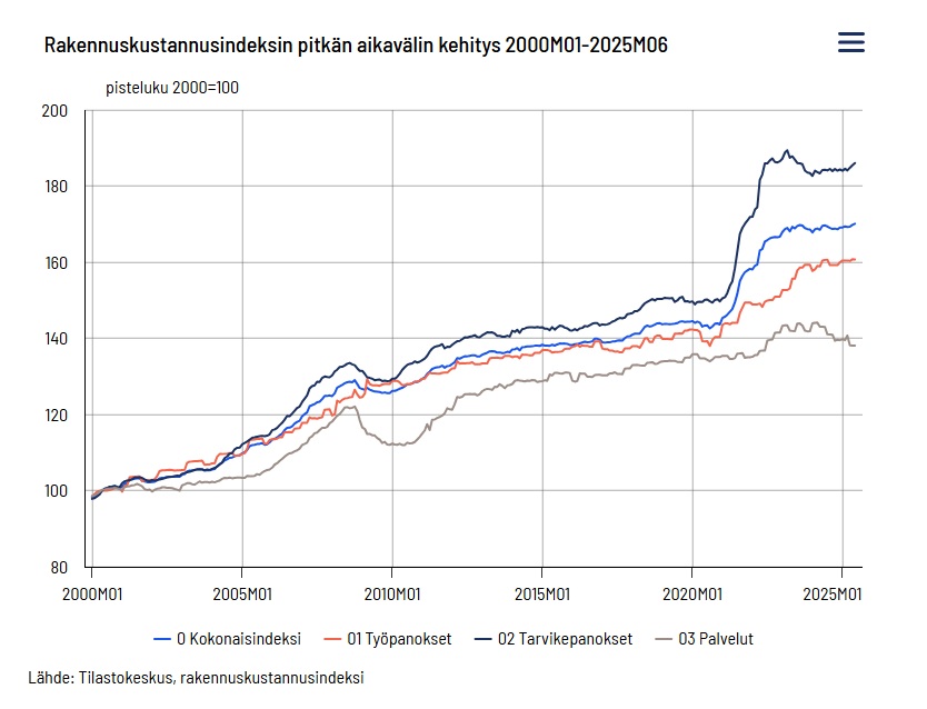 Tilastokeskuksen mukaan rakennuskustannukset nousivat kesäkuussa 0,2 prosenttia vuoden takaisesta. Tarvikepanoksista kustannukset nousivat vuodessa eniten puurakenteissa (8,6 %) ja maa-aineksissa (5,6 %). Kustannukset laskivat vuodessa eniten lämpö-, vesi- sekä viemäritarvikkeissa (-4,3 %) ja rakennusalueen pintarakenteissa (-2,9 %).