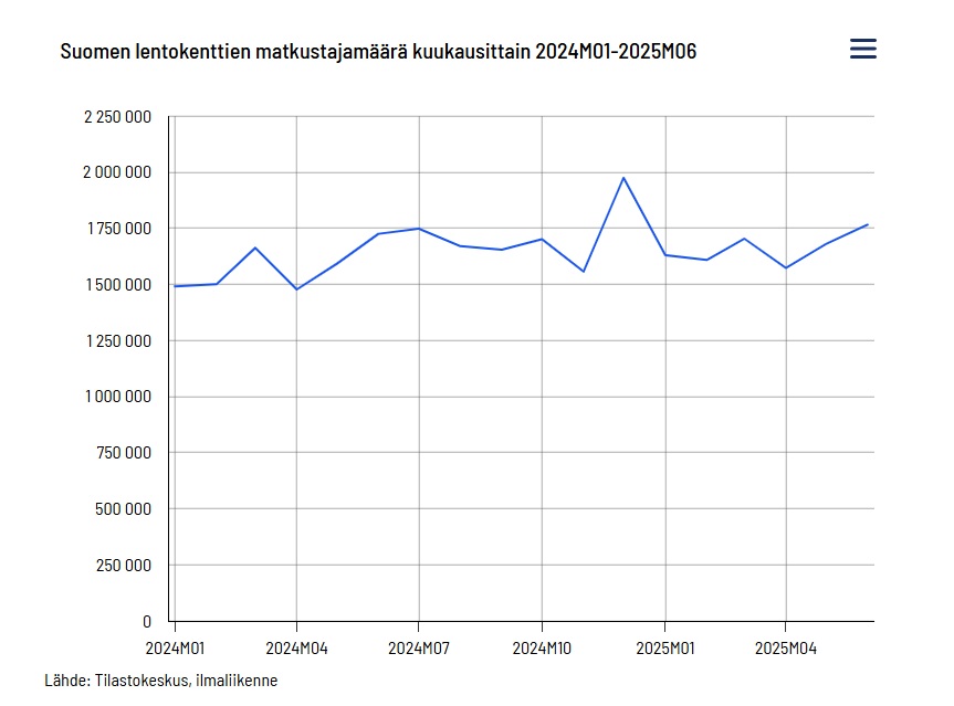 Tilastokeskuksen mukaan Suomen lentokenttien kautta lensi yhteensä lähes 1,8 miljoonaa matkustajaa kesäkuussa. Kokonaismatkustajamäärä kasvoi kaksi prosenttia vuoden 2024 kesäkuuhun verrattuna. Kotimaanlentojen matkustajamäärä laski kaksi prosenttia, kun taas ulkomaanlentojen matkustajamäärä kasvoi kolme prosenttia edellisvuodesta.