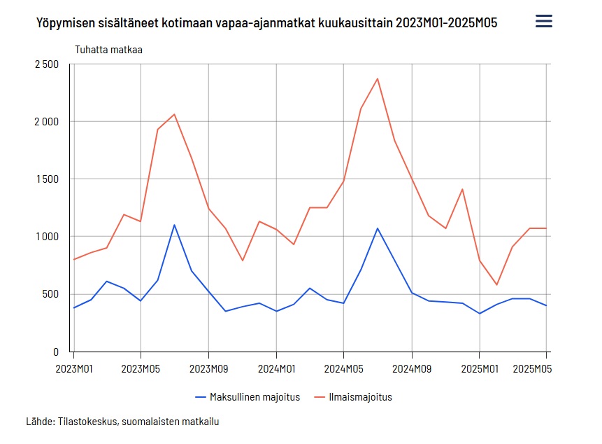 Tilastokeskuksen mukaan yöpymisen sisältäneitä kotimaan vapaa-ajanmatkoja tehtiin toukokuussa noin 1,5 miljoonaa, mikä on neljänneksen vähemmän kuin vuotta aiemmin. Matkamäärän lasku johtui lähinnä ilmaismajoitusmatkojen määrän vähenemisestä. Ulkomaan vapaa-ajanmatkojen määrä väheni reilun kymmenyksen ja oli noin 0,5 miljoonaa toukokuussa.