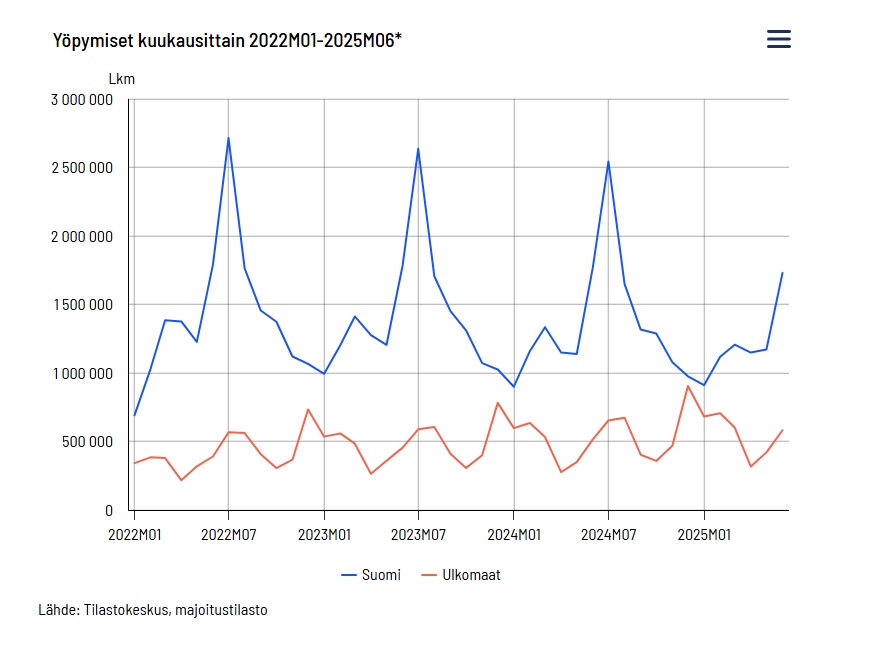 Tilastokeskuksen ennakkotietojen mukaan majoitusliikkeissä kirjattiin 2,31 miljoonaa yöpymisvuorokautta kesäkuussa. Kotimaisten matkailijoiden yöpymisiä oli 1,73 miljoonaa ja ulkomaisten matkailijoiden yöpymisiä 0,58 miljoonaa. Yöpymisten kokonaismäärä oli lähes samalla tasolla kuin edellisvuonna.