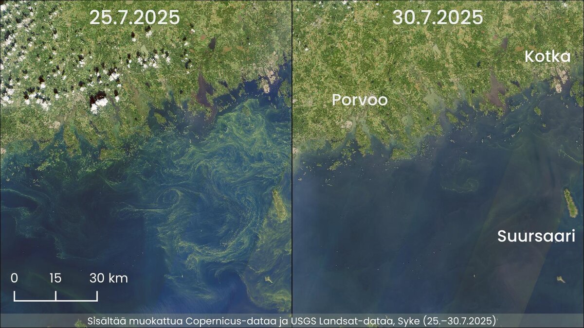 Suomenlahdella ja lounaisilla merialueilla alkuviikon tuulinen ja sateinen sää on rauhoittanut sinilevätilannetta viime viikkoon ja viikonloppuun verrattuna. Kuitenkin vielä viikonloppuna itäisellä Suomenlahdella oli runsaita pintalevälauttoja, mutta kukinnat ovat sittemmin sekoittuneet veteen. Selkämerellä sinilevä esiintyy yhä pääosin sekoittuneena veteen ja sinilevän määrä on ajankohdalle tyypillisen korkea.