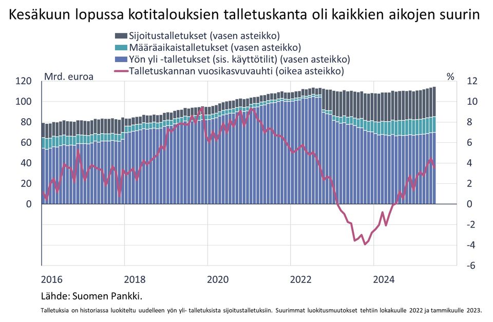 Suomalaisten kotitalouksien talletuskanta (114,7 miljardia euroa) oli kesäkuun lopussa kaikkien aikojen suurin. Se oli lähes neljä miljardia euroa suurempi kuin vuosi sitten vastaavana aikana. Kesäkuun lopussa kotitalouksien talletuksista 69,9 miljardia euroa oli yön yli -talletuksia, 15,4 miljardia euroa määräaikaistalletuksia ja 29,4 miljardia euroa sijoitustalletuksia. Kesäkuussa yön yli -talletusten vuosikasvuvauhti oli 2,7 prosenttia, määräaikaistalletusten 10,1 prosenttia ja sijoitustalletusten 2,5 prosenttia.