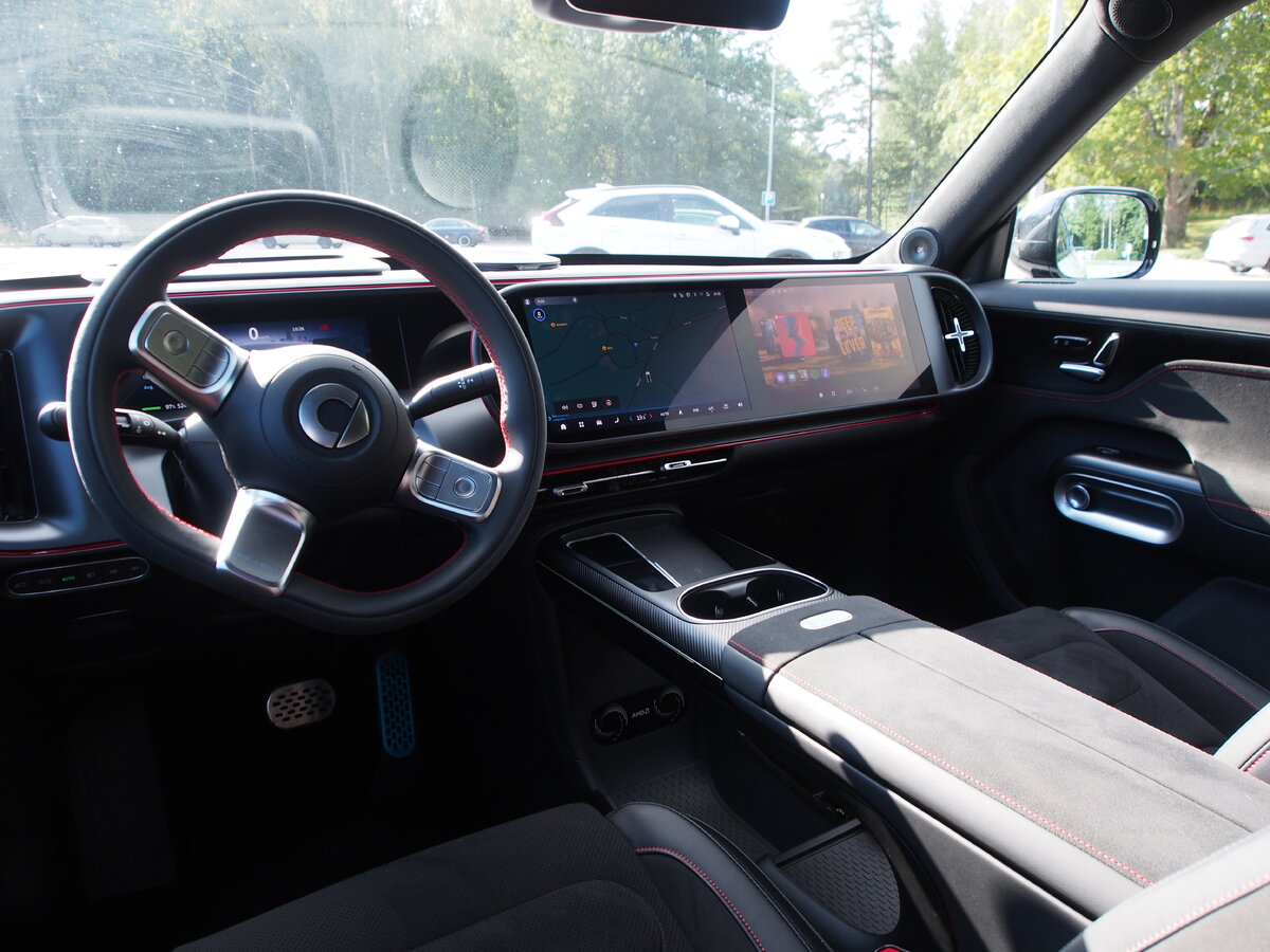 Autossa sisällä on kerrankin tilaa vaikka muille jakaa, niin edessä kuin takana. Kojelaudassa on kaksi suurta kosketusnäyttöä, joista oikeanpuolimmaisen voi pyhittää yksinomaan hanttimiehen henkilökohtaiseksi viihdekeskukseksi. Ohjauspyörän takana on kolmas toimintonäyttö, joka näyttää lähimpien autojen ja kohteiden reaaliaikaisen sijainnin ja lisäksi on tuulilasinäyttö, johon saa heijastettua navigaagttorinkin ymmärrettävästi.