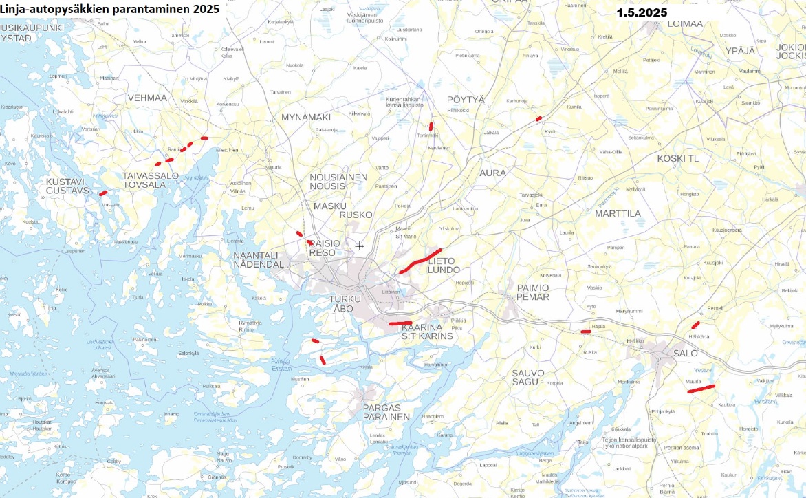 Varsinais-Suomen alueella käynnistyy linja-autopysäkkien parannusprojekti, jonka tavoitteena on pysäkkien yleisilmeen parantaminen. Pysäkit sijaitsevat Salossa, Kaarinassa, Turussa, Liedossa, Maskussa, Vehmaalla ja Taivassalossa. Eniten parannuksia tehdään maantiellä 110 (Uudenmaantie) ja maantiellä 192 (Kustavintie).