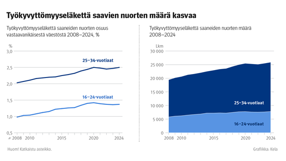 Pitkän kasvun jälkeen työkyvyttömyyseläkettä saaneiden nuorten määrä laski vuosina 2021–22, mutta vuosina 2023–24 on taas nähtävissä hienoista kasvua saajamäärissä. Työkyvyttömyyseläkettä saaneita 16–34-vuotiaita oli vuoden 2024 lopussa noin 25 900, mikä tarkoittaa kahta prosenttia saman ikäisestä väestöstä.