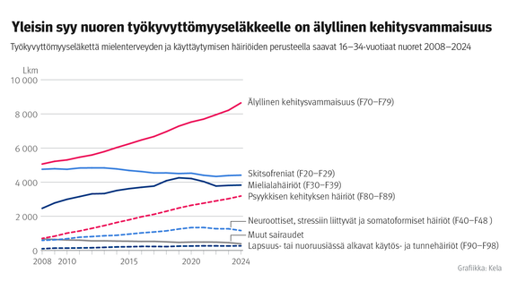 Älyllinen kehitysvammaisuus oli viime vuonna perusteena 3 800 alle 25-vuotiaan nuoren työkyvyttömyyseläkkeelle. Masennuksen merkitys työkyvyttömyyseläkkeen syynä alkaa yleistyä lähempänä 30–40 vuoden ikää. Yhteensä 3 100 iältään 25–34-vuotiasta sai työkyvyttömyyseläkettä mielialahäiriön vuoksi. Heistä masennuksen (F32– F33) vuoksi eläkkeellä oli 2 300.