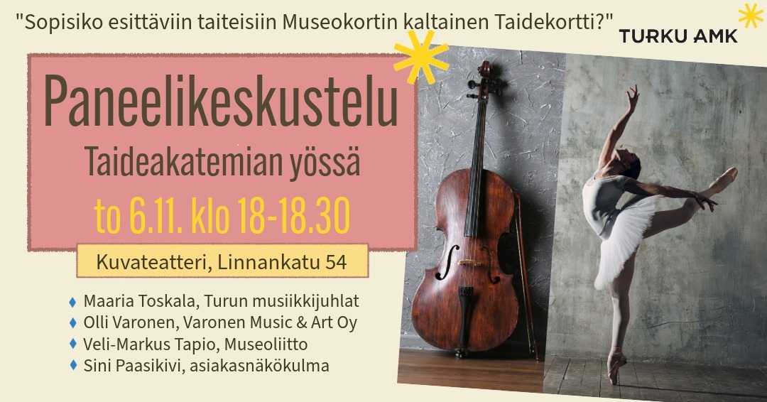 Taideakatemian yössä järjestetään kello 18 paneelikeskustelu Sopisiko esittäviin taiteisiin Museokortin kaltainen Taidekortti? Keskustelussa pohditaan, olisiko Taidekortista iloa ja hyötyä esittäviin taiteisiin ja mitkä voisivat olla kortin ensiaskeleet. Myös yleisö pääsee esittämään kysymyksiä panelisteille.