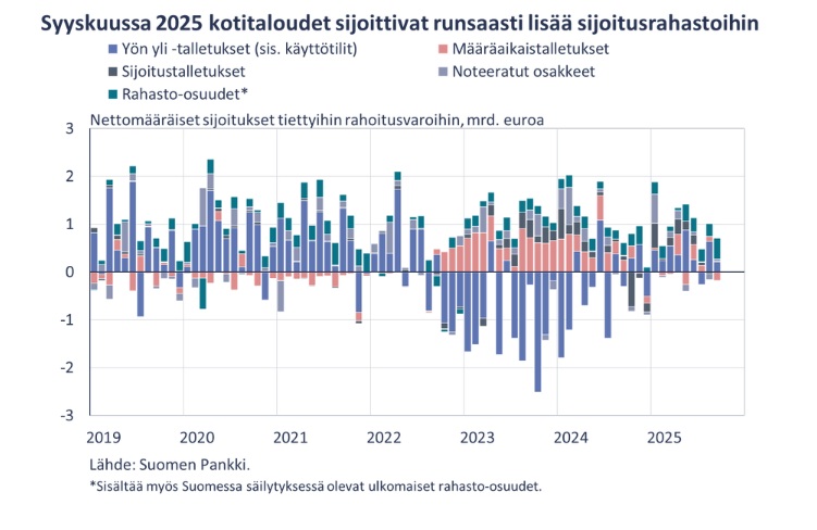 Suomalaiset kotitaloudet sijoittivat suomalaisten sijoitusrahastojen lisäksi 62 miljoonaa euroa lisää ulkomaisiin sijoitusrahastoihin, joten yhteensä kotitaloudet tekivät merkintöjä sijoitusrahastoihin 438 miljoonan euron edestä. Syyskuun lopussa myös kotitalouksien rahasto-osuusomistukset ulkomaisista sijoitusrahastoista (9,9 mrd. euroa) olivat suurimmillaan kautta aikojen. Kotitalouksien sijoituksista ulkomaisiin rahastoihin suurin osa (77 %) oli osakerahastoissa. Lisäksi kotitalouksilla on merkittävä määrä sijoituksia kotimaisiin ja ulkomaisiin sijoitusrahastoihin sijoitussidonnaisten vakuutussopimusten kautta.