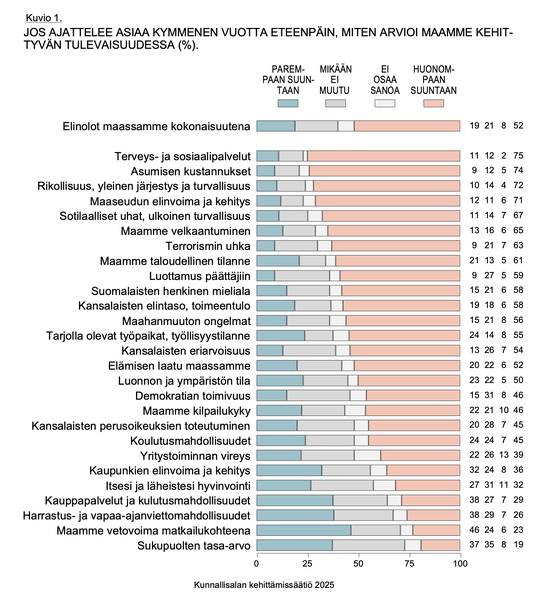 Muilta osin näkemykset ovat karun pessimistisiä. Peräti 17 asiassa suomalaisten enemmistö odottaa kehityksen maassa kulkevan huonompaan suuntaan. Näihin kuuluvat etenkin terveys- ja sosiaalipalvelut (75 %), asumisen kustannukset (74 %), rikollisuus ja turvallisuus (72 %), maaseudun elinvoima ja kehitys (71 %), sotilaalliset uhkat (67 %), maan velkaantuminen (65 %), terrorismin uhka (63 %) ja maan talouden tila (61 %).