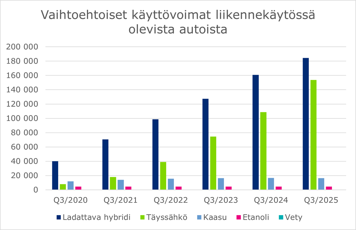 Viimeisen kolmen vuoden aikana ladattavien autojen määrä on kasvanut noin 200 000:lla. Samalla bensiinillä ja dieselillä kulkevien autojen määrä on vähentynyt 250 000:lla.