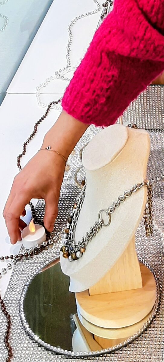 Pieni on kaunista -hengessä Fabricius esittelee näyteikkunan strassikankaalla päällystettyjen tasojen, peilien ja tuikkujen kimmeltävää yhdistelmää, josta olisi iloa vaikka joulupöydän koristeluna.