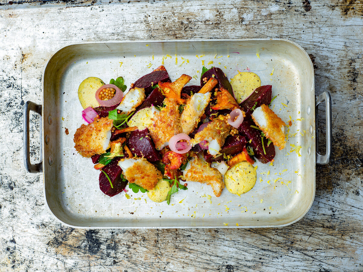 Panko-ahvenfileet ja punajuurisalaatti