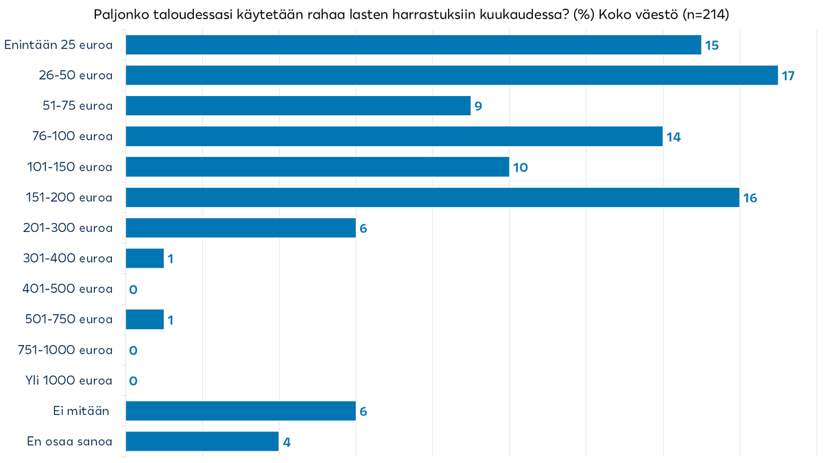 Hintojen nousu näkyy yhä selvemmin lapsiperheiden arjessa, ja yksi kärsivistä alueista on harrastustoiminta. Yli puolet (55 %) suomalaisista lapsiperheistä käyttää lastensa harrastuksiin rahaa enintään sata euroa kuukaudessa. Kolmasosalla (32 %) rahaa kuluu kuukausittain kuitenkin enemmän, 100–300 euroa kuukaudessa. Summat selviävät LähiTapiolan tuoreesta Arjen Katsaus -kyselystä, jonka toteutti tutkimusyhtiö Verian.