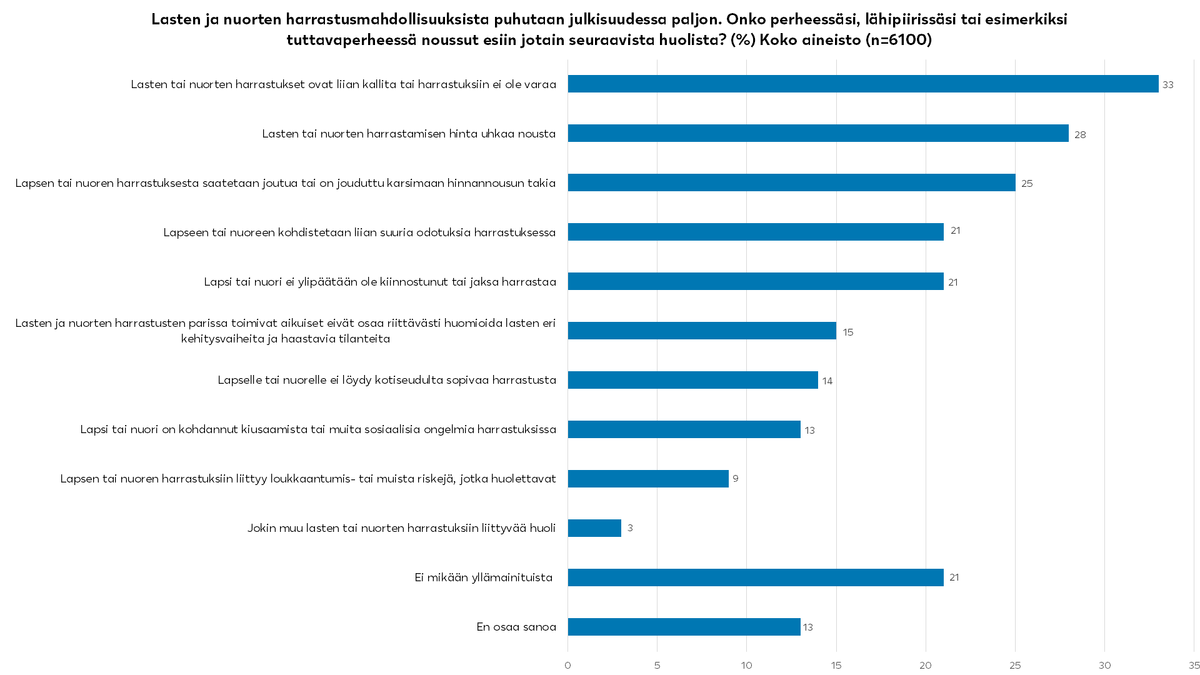 – Moni perhe vaikuttaakin joutuneen viime vuosina karsimaan lasten harrastuksista kustannussyistä. Tästä kertoo myös aiemmin keväällä toteuttamamme kyselytutkimus, jossa kolmasosa vastaajista piti lasten ja nuorten harrastuksia liian kalliina ja neljäsosa kertoi, että niistä saatetaan joutua tai on jouduttu karsimaan hinnannousun takia. Liikuntaharrastukset eivät enää ole yhdenvertaisesti kaikkien saavutettavissa. Niiden lasten osuus, jotka eivät voi osallistua normaaliin seuratoimintaan ilman tuettua harrastamista tai maksuttomia harrastusryhmiä, on lisääntynyt, Haarala toteaa.