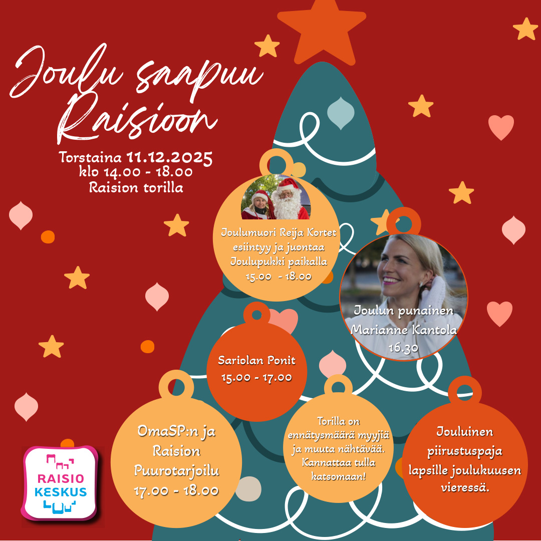Raision torilla järjestetään torstaina 11. joulukuuta perinteinen Joulu saapuu Raisioon -tapahtuma, joka virittää raisiolaiset joulun tunnelmaan. Mukaan on tulossa ennätysmäärä myyjiä ja tapahtumalavalla nähdään ja kuullaan jouluista ohjelmaa. Lapsia ilostuttaa ilmainen poniratsastus kello 15–17 ja lumikasa. Kaikille osallistujille hyvän jouluisen maun suuhun jättää Oma SP:n ja Raision kaupungin kello 17 tarjoama ilmainen joulupuuro.