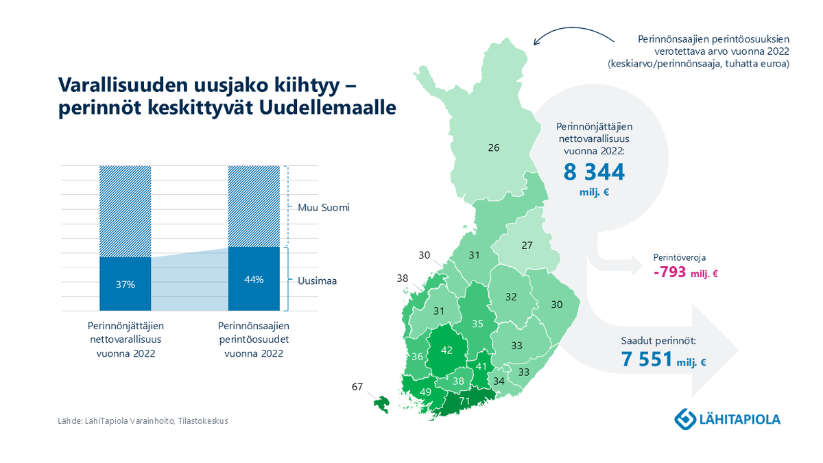 Suomalaiset saivat yli 7,5 miljardin euron edestä perintöjä vuonna 2022. Perintöinä siirtyi yli 30 prosenttia enemmän varallisuutta kuin neljä vuotta aiemmin. Suurimmat perinnöt jaetaan Uudellamaalla, minkä lisäksi maakunta saa ”muuttovoittoa” muualta Suomesta. Kyselyn mukaan viisikymppiset odottavat suurimpia perintöjä.