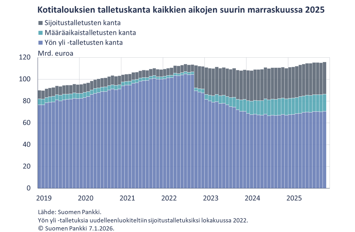 Kotitalouksien talletuskanta kasvoi marraskuussa vuodentakaisesta 4,3 prosenttia, kun marraskuussa 2024 talletuskanta kasvoi 2,8 prosenttia vuosikasvuvauhtia. Tammi–marraskuussa kotitaloudet kasvattivat nettomääräisesti eniten yön yli -talletuksiaan, yhteensä 3,5 miljardia euroa. Sijoitustalletuksiin kotitaloudet sijoittivat nettomääräisesti vastaavalla ajanjaksolla 1,4 miljardia euroa ja määräaikaistalletuksiin 700 miljoonaa euroa. Uusia määräaikaistalletussopimuksia kotitaloudet tekivät marraskuussa 1,2 miljardin euron edestä, mikä oli lähes saman verran kuin vuotta aiemmin vastaavana ajankohtana huolimatta laskeneista koroista. Uusista määräaikaistalletussopimuksista 91 prosenttia oli enintään vuoden pituisia ja loput tätä pidempiä.