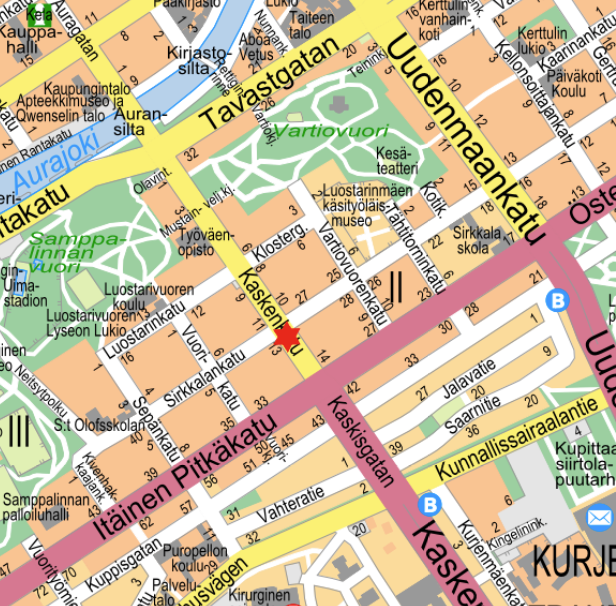 Kaukolämpötyötä tehdään Kaskenkatu 13:n kohdalla 12.1.–28.2.2026. Ajorata on kavennettu työmaan kohdalla. Kääntyminen Kaskenkadulta Sirkkalankadulle on estetty.