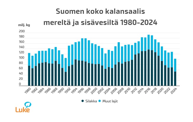 Suomen merialueen kalansaalis väheni vuonna 2024. Kokonaissaalis oli 102 miljoonaa kiloa, ja siitä reilu puolet oli silakkaa. Kalanviljely tuotti 16,6 miljoonaa kiloa ruokakalaa, josta 95 prosenttia oli kirjolohta.