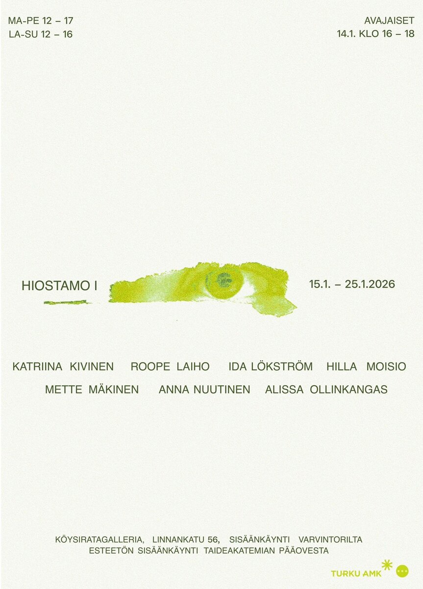 Hiostamo-näyttelysarjan ensimmäisen näyttelyn avajaisia vietetään keskiviikkona 14. tammikuuta kello 16–18 Turun AMK.n Taideakatemian Köysiratagalleriassa. Hiostamo-näyttelyyn huipentuu kuvataiteen kolmannen vuoden opiskelijoiden kuluneen syksyn taiteellinen työskentely. Näyttely on esillä 15.–25. tammikuuta.