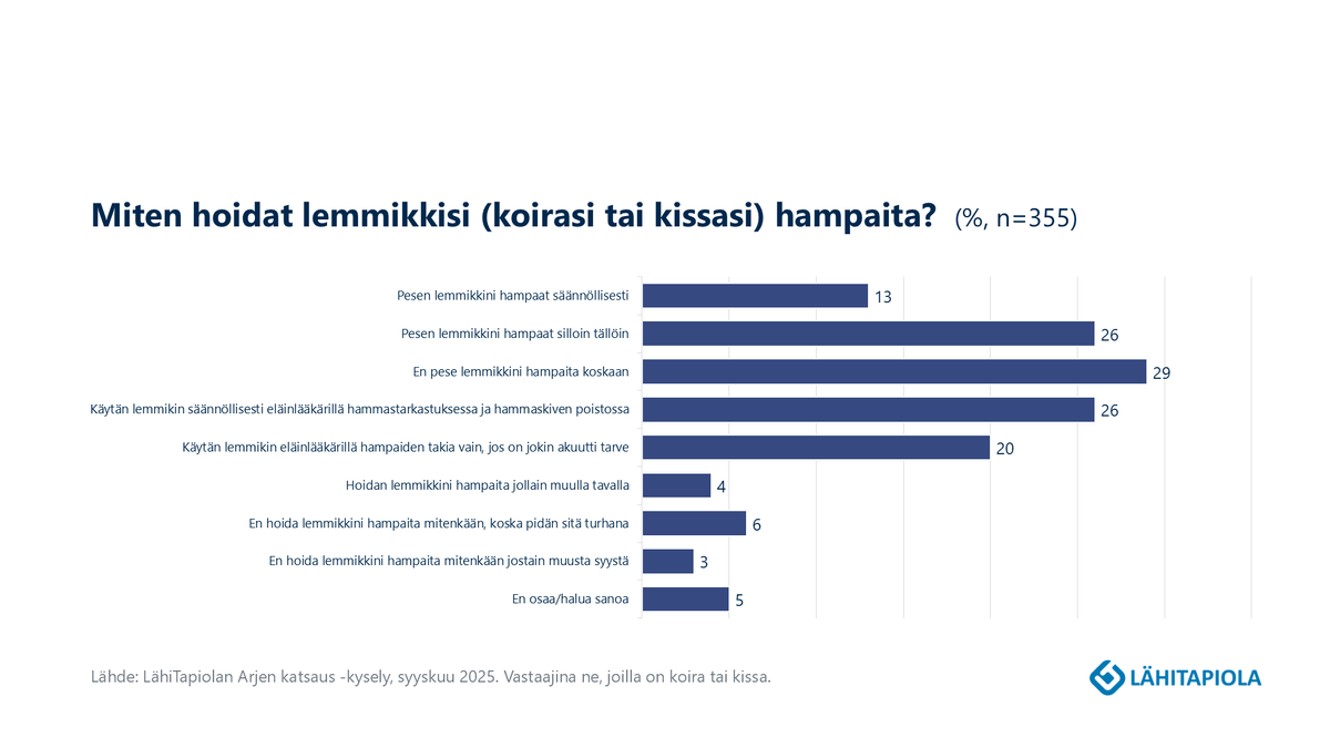 Vain noin 13 prosenttia koiran- tai kissanomistajista harjaa lemmikkinsä hampaat säännöllisesti, selviää LähiTapiolan Arjen katsaus -kyselystä. 29 prosenttia ei pese lemmikkinsä hampaita koskaan. Kyselyn toteutti tutkimusyhtiö Verian.