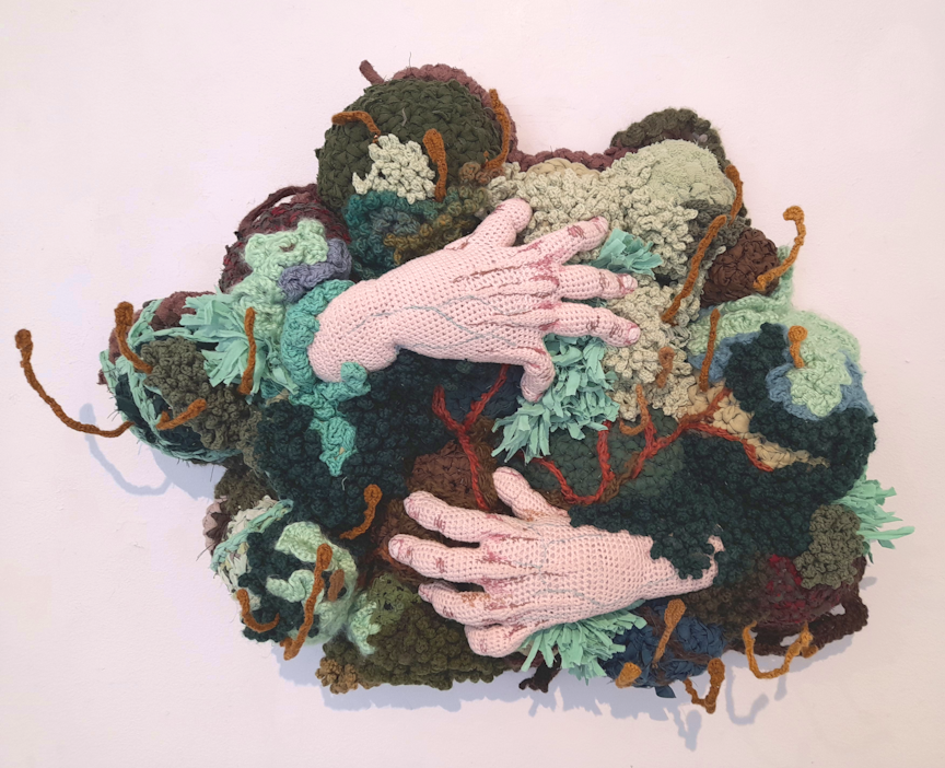 – Olen pohtinut paljon kuluttamista ja kuinka se vaikuttaa maailman tilaan ja ihmisiin. Tämän ajatusketjun yksi haaroista on ollut myös miten ja millaisilla välineillä teen taidetta. Ajauduin vähän vahingossa virkkaamaan, minkä myötä huomasin, kuinka helppoa materiaalia oli saada käsiinsä, sanoo Korkiakangas tiedotteessa