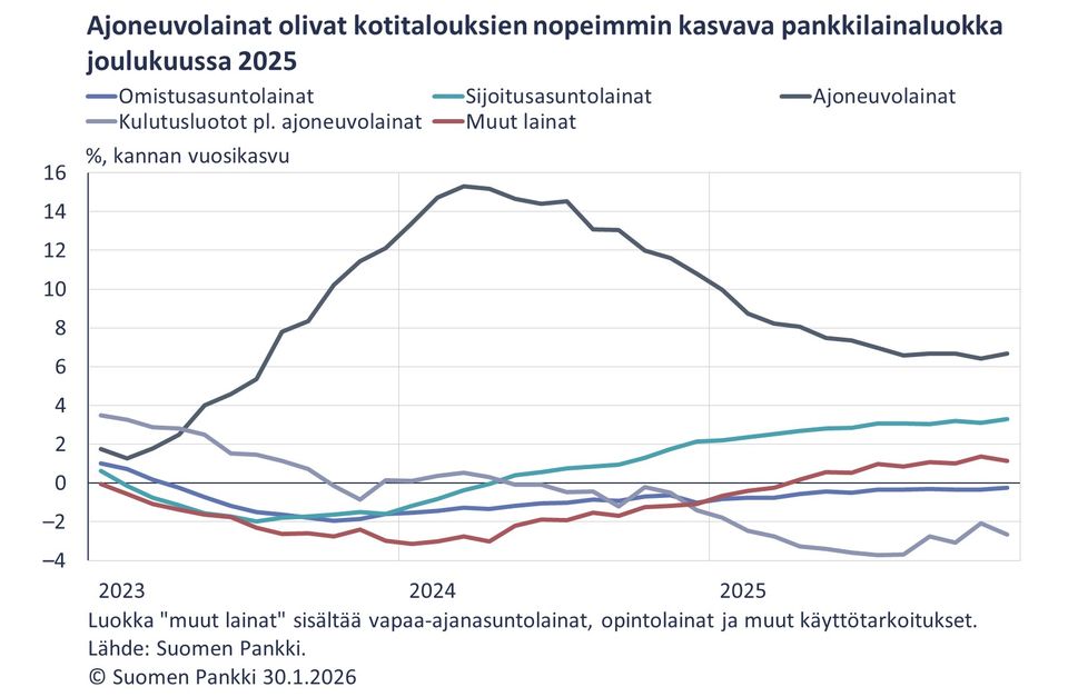 Joulukuussa kasvoivat myös opintolainakanta (5,8 %), vapaa-ajanasuntolainakanta (1,1 %) ja ajoneuvolainakanta (6,7 %). Pankkien myöntämien ajoneuvolainojen kanta kasvoi koko vuoden ajan melko rivakkaa, joskin hidastuvaa tahtia. Viime vuonna nostettujen uusien ajoneuvolainojen määrä (2,4 miljardia. euroa) oli kuitenkin täsmälleen sama kuin edeltävänä vuonna. Lainakannan kasvu on tullut erityisesti 5–10 vuoden mittaisista ajoneuvolainoista, joiden nostomäärät kasvoivat jo vuosina 2023–24.