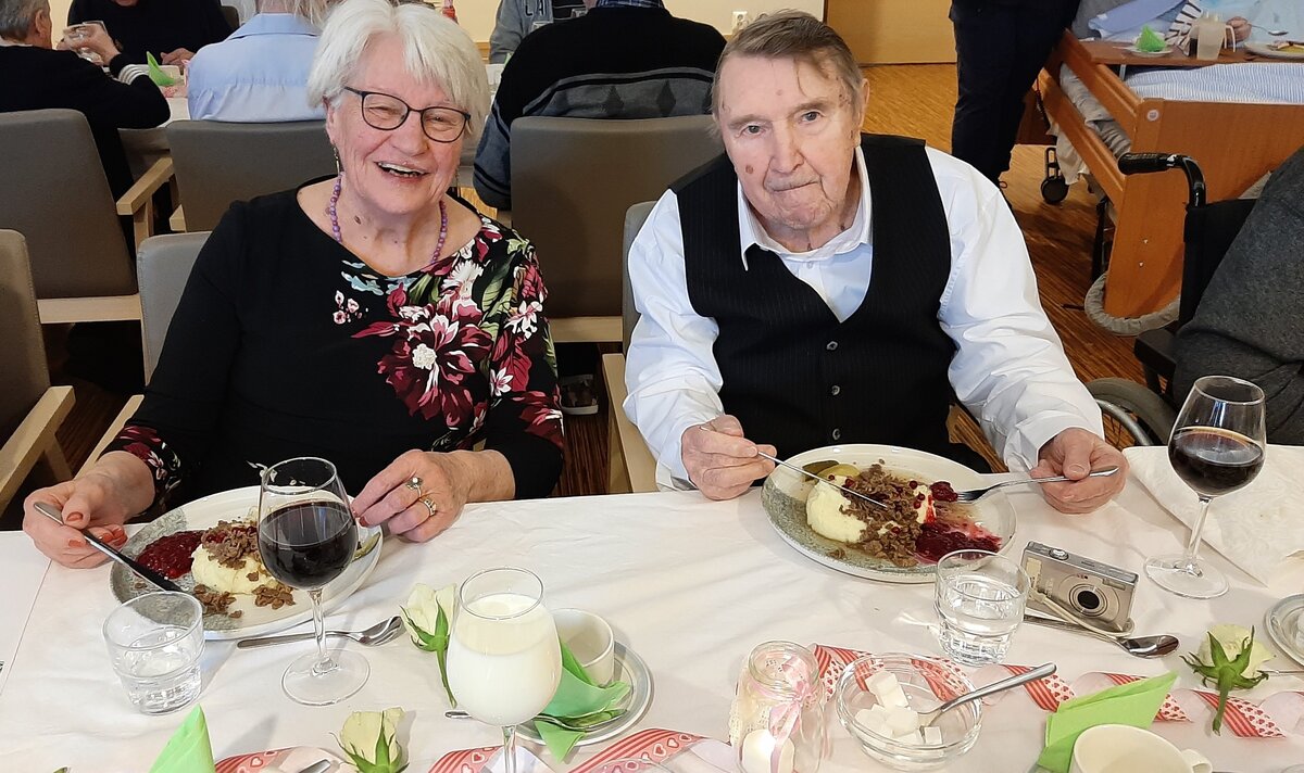 Ystävänpäivän aterioinnin taustalla soi klassinen musiikki tunnelmaa täydentämässä. Aulikki Kolehmainen, 92, ja Eino Koli, 94, ovat molemmat yhteisöllisen asumisen asukkaita.