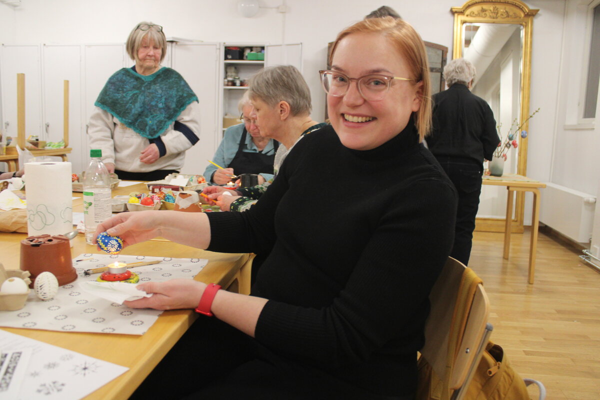 Aloittelijakurssille osallistunut Satu Liljeroos kertoo ihailleensa yhdistyksen esillä olleita pääsiäismunia Luostarinmäen museon pääsiäistapahtumassa ja Iso-Puolalassa, joten hän innostui aloittamaan itsekin munien maalaamiseen.