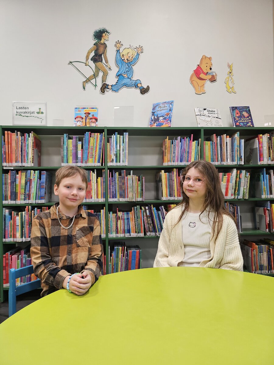 Neljäsluokkalaiset Maya Aristotel ja Miilo Riuttanen viihtyivät julkaisujuhlassa.