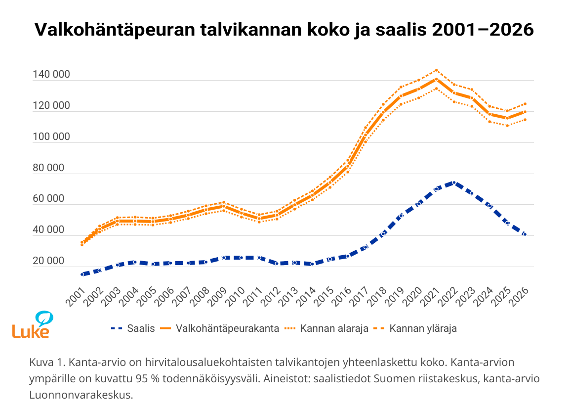 Luonnonvarakeskuksen (Luke) arvion mukaan helmikuussa Suomessa oli 120 000 valkohäntäpeuraa (95 % todennäköisyysväli: 115 000–125 000). Kanta on kasvanut viime vuodesta 3,5 prosenttia.