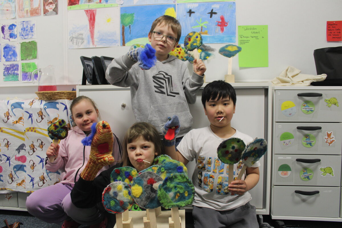 Animaatioiden lisäksi lapset olivat saaneet koulussa tuunata vanhoista villasukista Töppötassu-hahmoihin perustuvia käsinukkeja sekä huovuttaneet kirjassa esiintyvän läsnäolon voiman -tikkarin.