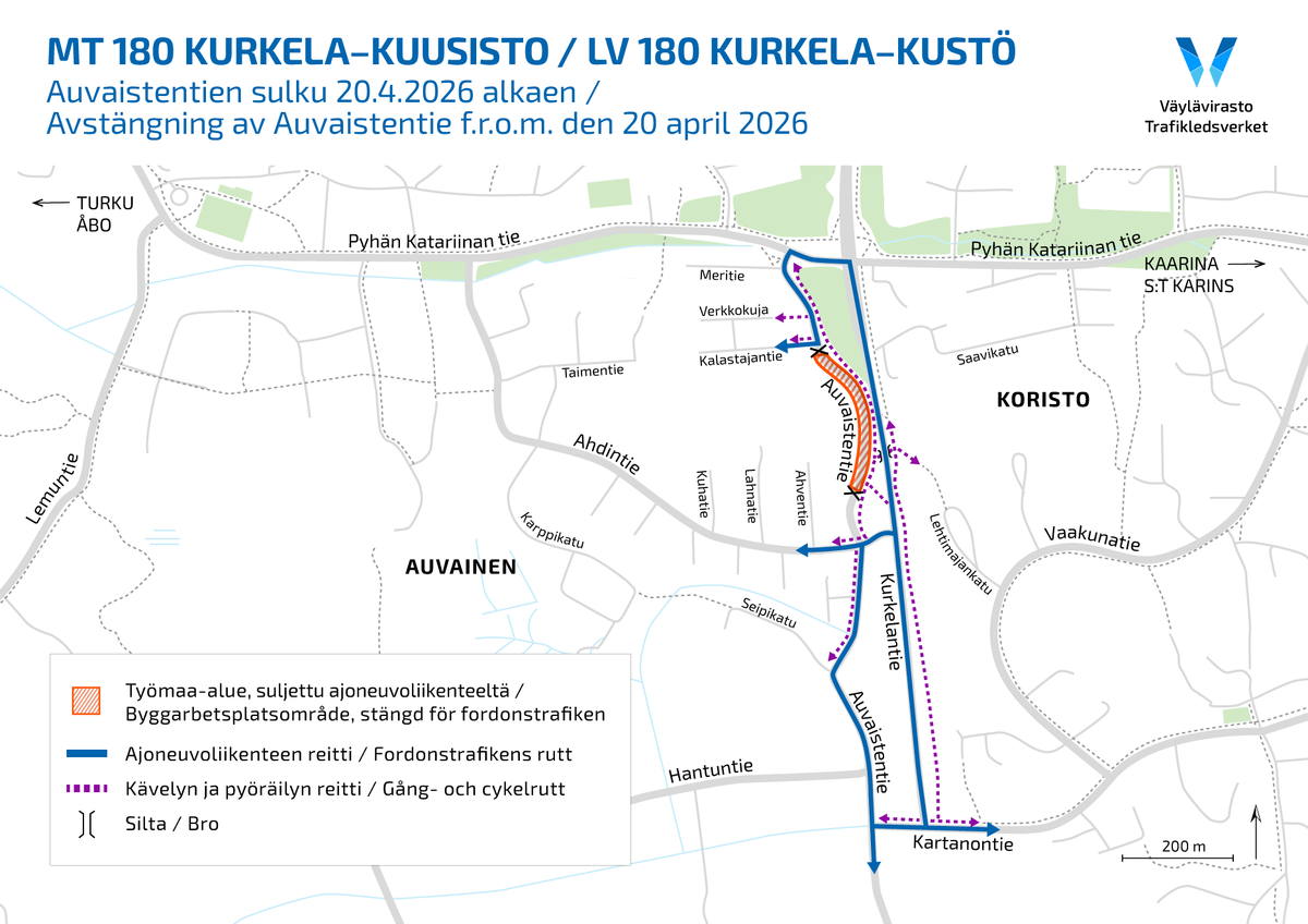 Kaarinassa sijaitseva Auvaistentie suljetaan Kalastajantien ja Auvaistentie nro 43 välillä ajoneuvoliikenteeltä Mt 180 Kurkela-Kuusisto -hankkeessa edistettävien töiden mahdollistamiseksi. Liikenne ohjataan Kurkelantien kautta. Kiertoreitti on esitetty tiedotteen liitteenä olevassa karttakuvassa.