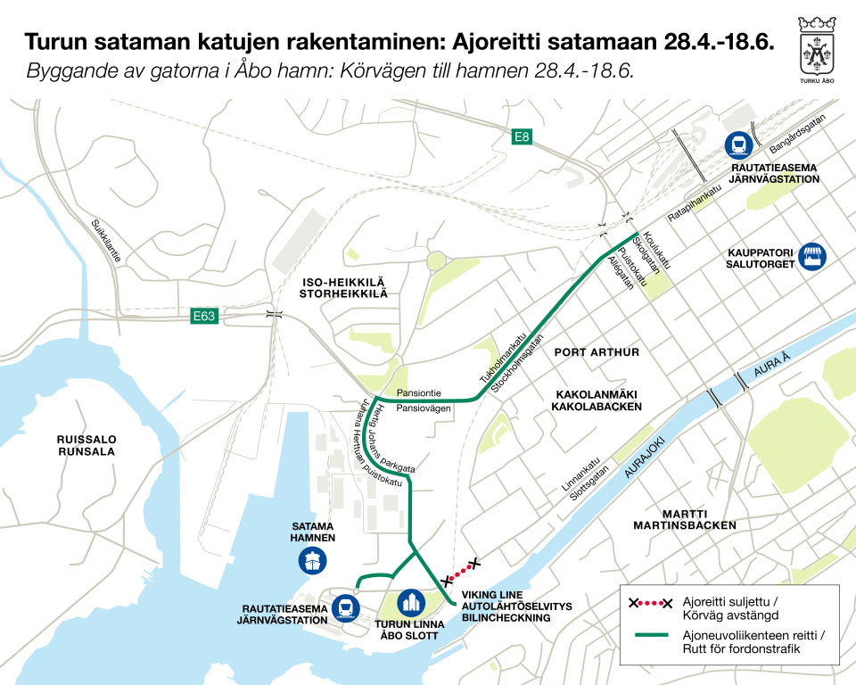 Turun keskustan suunnasta tulevien on valittava kiertoreitti Tukholmankadun ja Pansiontien kautta Juhana Herttuan puistokadulle ja sieltä Satamakadulle. Reitille opastetaan Koulukadulta alkaen.