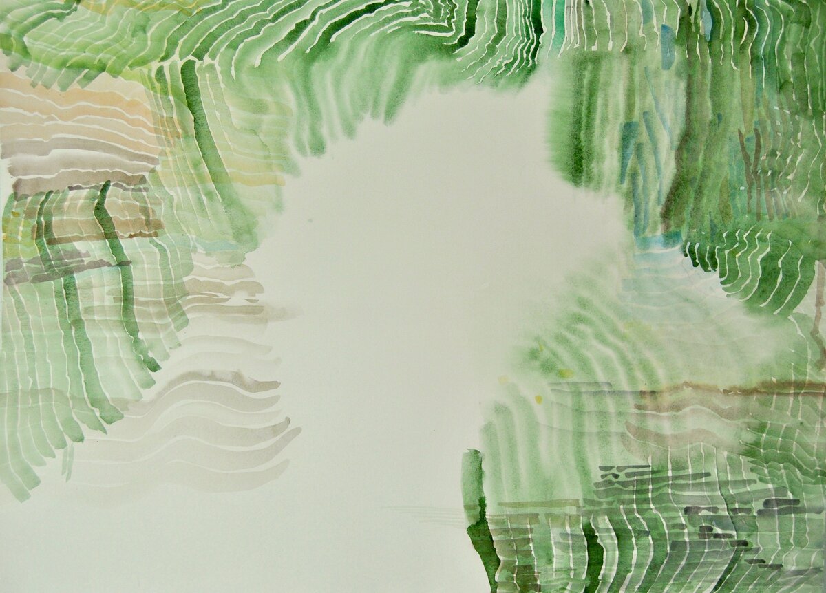 – Maisemat, ja niiden muutokset kulkevat mukana vähintäänkin ajatuksissa. Esimerkiksi itselleni tuttu Kokemäenjoki vieraslaji Isosorsimo kasvustoineen kaventaa paikka paikoin uomaa vauhdilla niin, että lahoavaan kaislamassaan kasvaa jo lehtipuita. Vesistöaiheisiin on tullut aineksia urbaanista elämästä ja havainnoista mutkikkailta reiteiltä kotoa työhuoneelle – reiteiltä, joissa vuorottelevat kulmikkaat tiheään rakennetut lähiöt ja taas yllättävän luonnollisina säilyneet metsikkömaisemat.