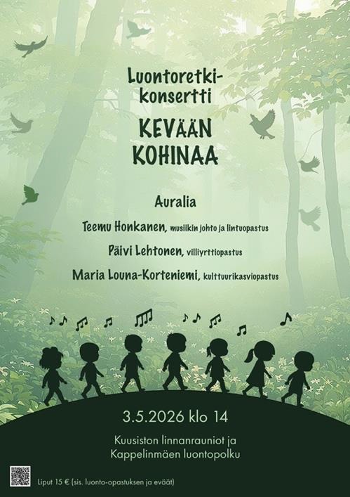 Kamarikuoro Auralia järjestää keväisen Kevään kohinaa -luontoretkikonsertin Kuusiston linnanraunioilla ja Kappelinmäen luontopolulla Kaarinassa sunnuntaina 3. toukokuuta kello 14. Tapahtuma yhdistää tuoreella tavalla opastetun luontoretken ja kuorokonsertin. Yleisö ja kuorolaiset patikoivat tapahtumassa yhdessä läpi kauniin luontopolun, jonka varrella lauletaan, seurustellaan ja tutustutaan oppaiden johdolla luontoon. Konsertin huipennuksena kuoro esiintyy keskiaikaisen piispanlinnan raunioilla.