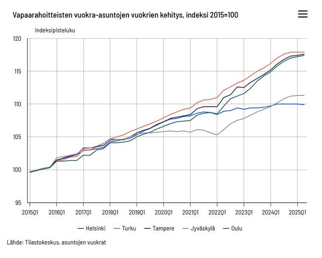Vapaarahoitteisten asuntojen vuokrat nousivat koko maassa 0,5 prosenttia huhti–kesäkuussa vuodentakaisesta. Pääkaupunkiseudulla vapaarahoitteiset vuokrat kuitenkin laskivat 0,3 prosenttia, kun muualla maassa nousua nähtiin 0,9 prosenttia. Vuokrat nousivat suurista kaupungeista eniten Rovaniemellä (2,0 %) ja laskivat eniten Vantaalla (-0,8 %).