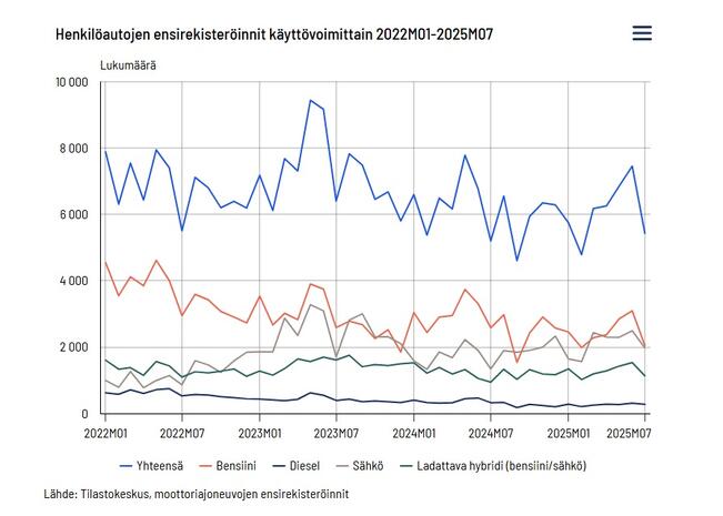 Tilastokeskuksen mukaan elokuussa rekisteröitiin uusia henkilöautoja 5 262, mikä oli 20 prosenttia vähemmän kuin vuotta aiemmin. Kaiken kaikkiaan elokuussa rekisteröitiin 9 247 uutta ajoneuvoa. Ensirekisteröinnit vähenivät 16 prosenttia edellisvuoden vastaavaan kuukauteen verrattuna.
