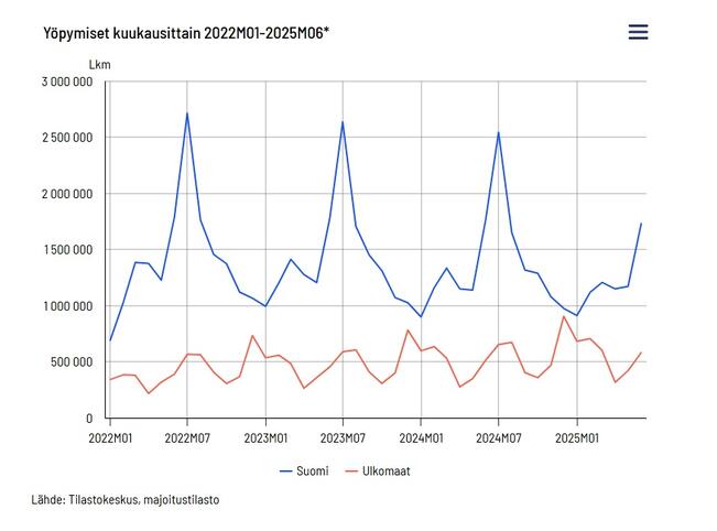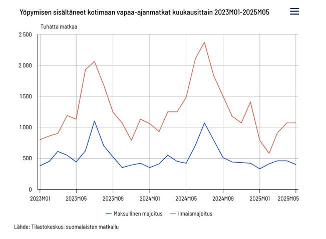 Tilastokeskuksen mukaan ulkomaan vapaa-ajanmatkoja tehtiin elokuussa yhteensä lähes 0,7 miljoonaa, kun mukaan lasketaan yöpymisen kohdemaassa sisältäneet matkat, risteilyt ja päivämatkat. Yöpymisen sisältäneitä kotimaan vapaa-ajanmatkoja tehtiin 2,1 miljoonaa, mikä on noin viidenneksen vähemmän kuin viime vuoden elokuussa.