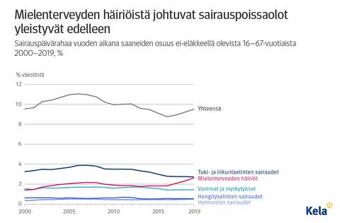 Mielenterveyden sairauksista johtuvan työkyvyttömyyden kasvu taittui